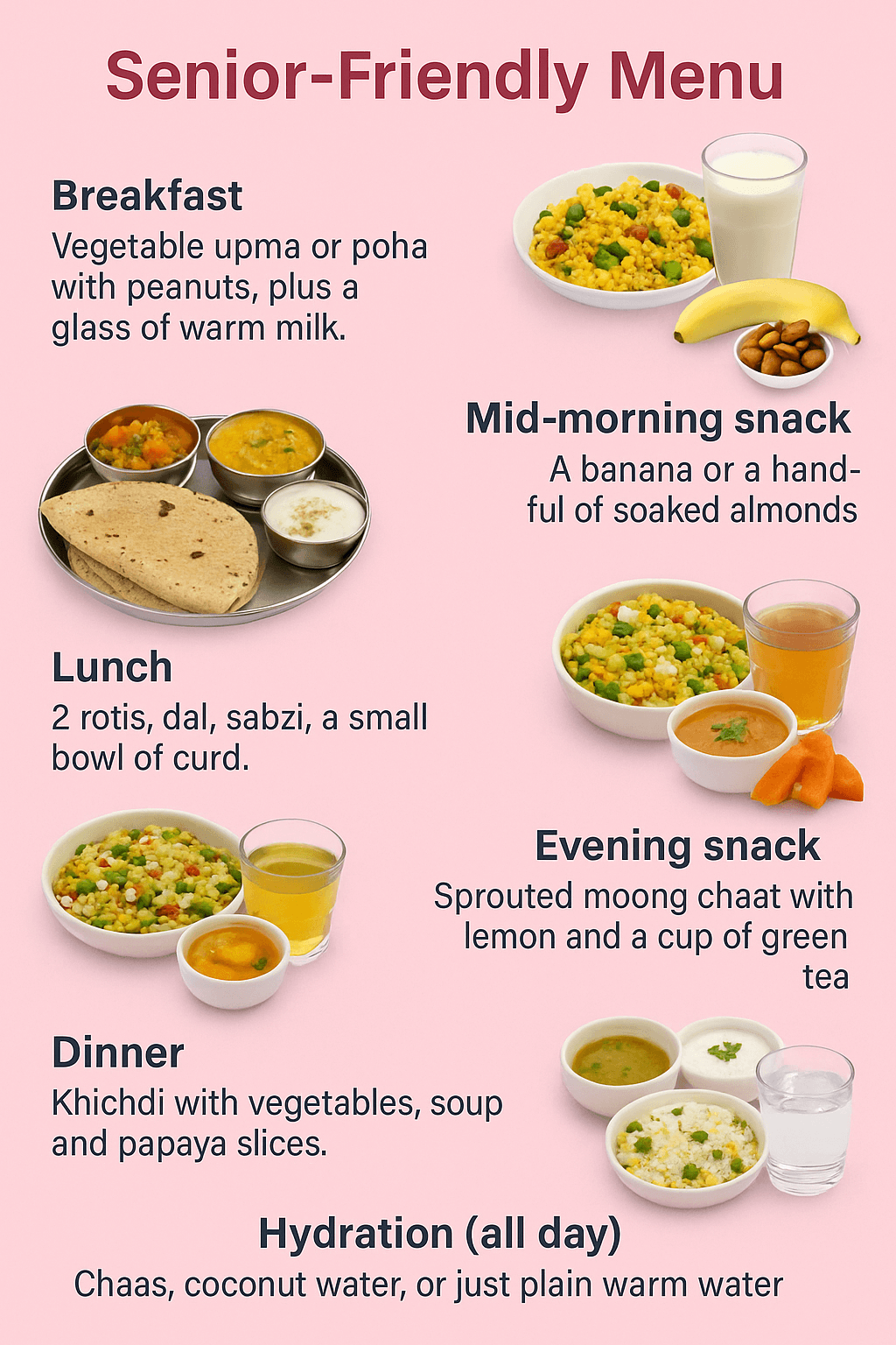 Here’s the sneaky bit: thirst signals fade with age, which means dehydration is common without anyone realizing. Sip on water, chaas, light soups, or coconut water throughout the day. Small glasses, often will work better than trying to chug a whole bottle. Keep a check on the amount of your intake.